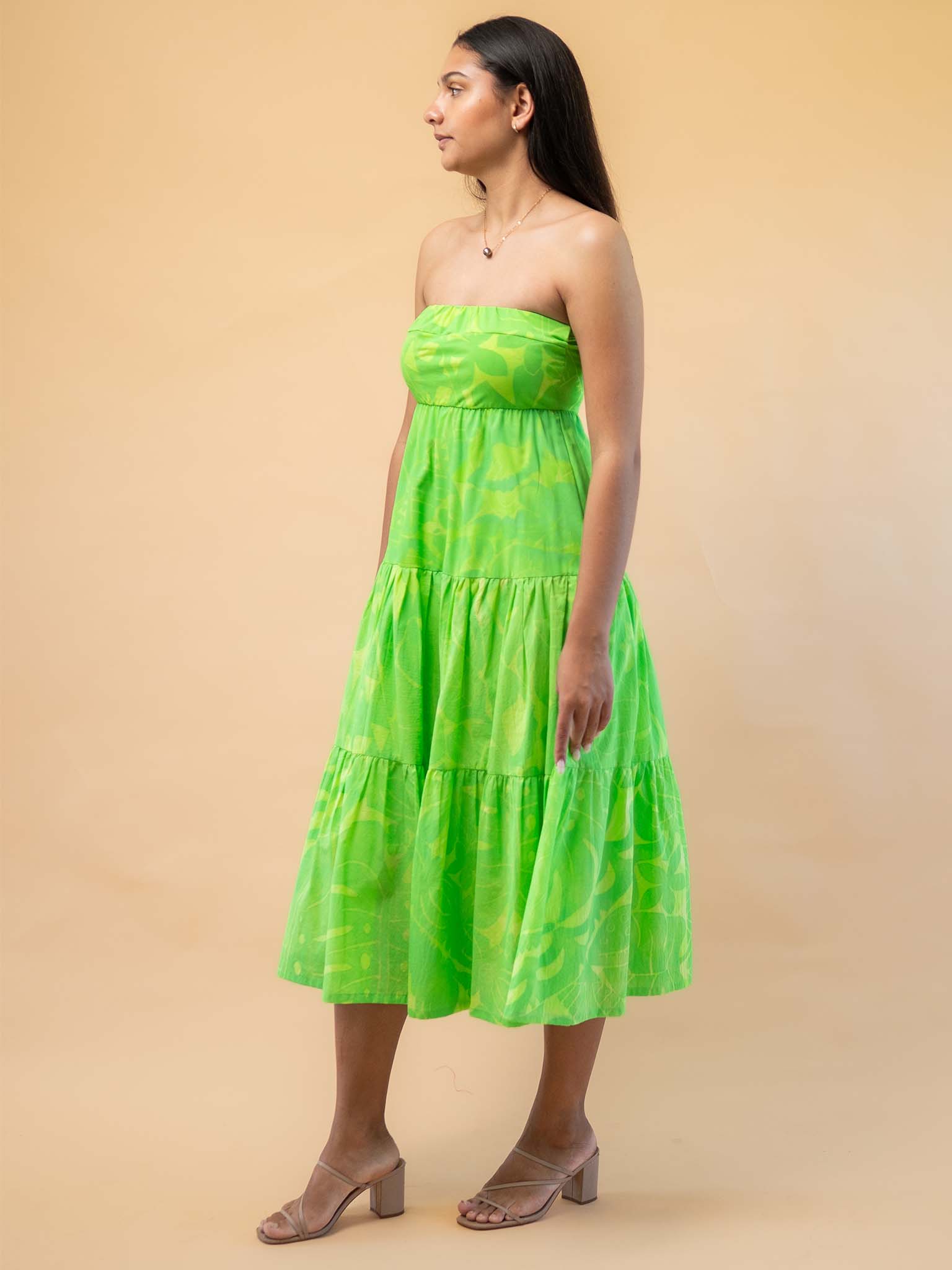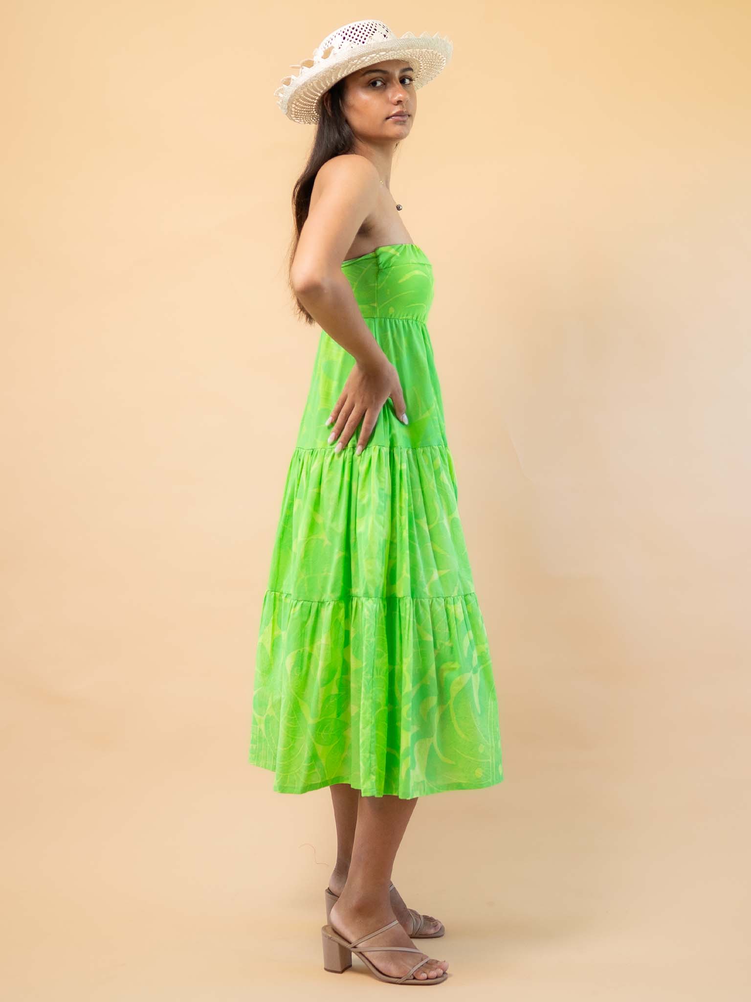 Crafted from a combination of cotton lyrca for the top with mini ruffle details and mull cotton rayon for the bodice. A strapless fitted top that cinches below the bust and drops to the calf. A flowy midi dress, for the those balmy summer nights. This dress is lined with a 100% cotton mull material. Light and breathable.