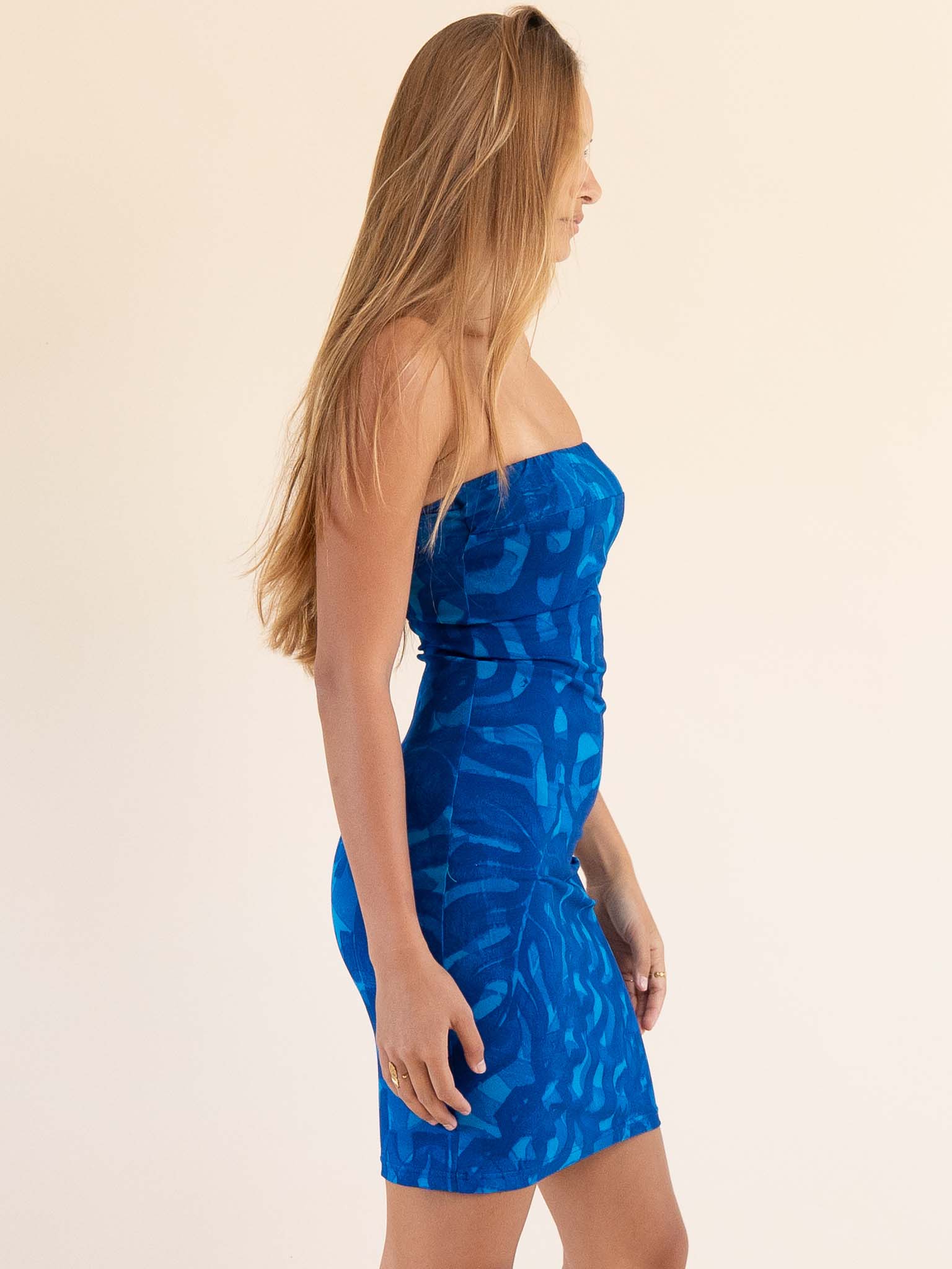 A mini version of our staple Mina strapless dress, skims the silhouette. With no zip and stretchy fabric it's a pullover access. Dress sits above knee.