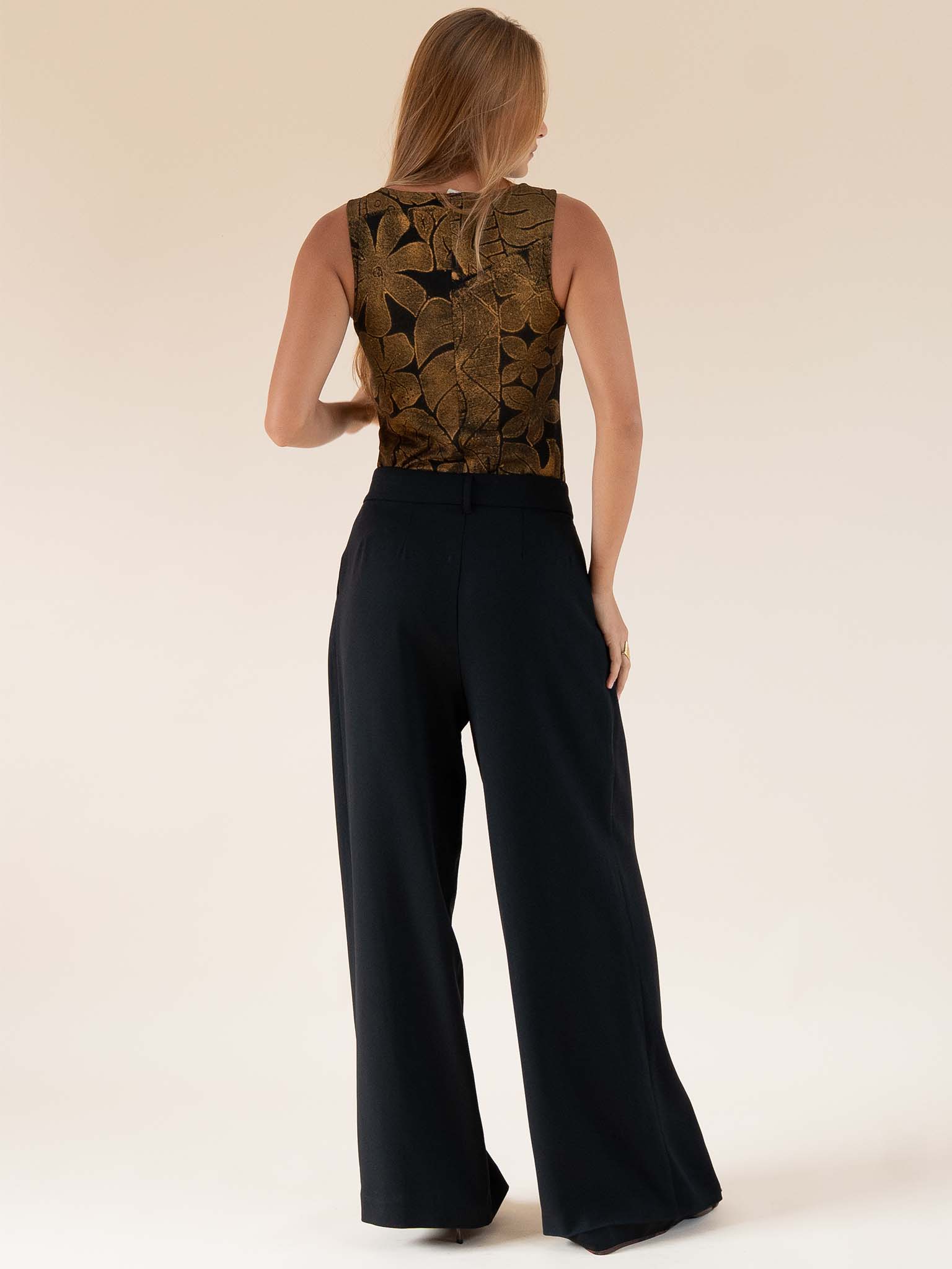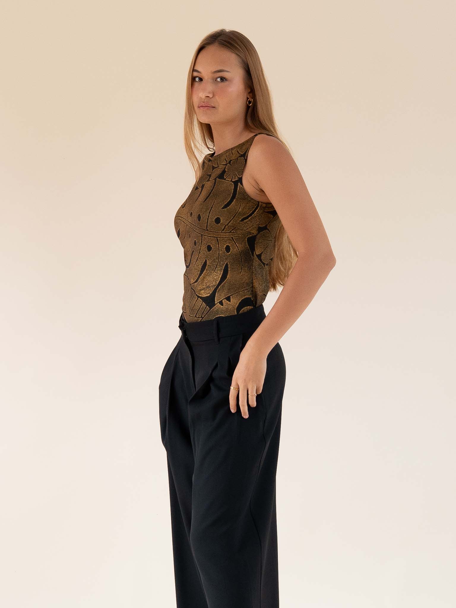 The Poeana top is sleeveless with a straight neckline and flared out bodice.