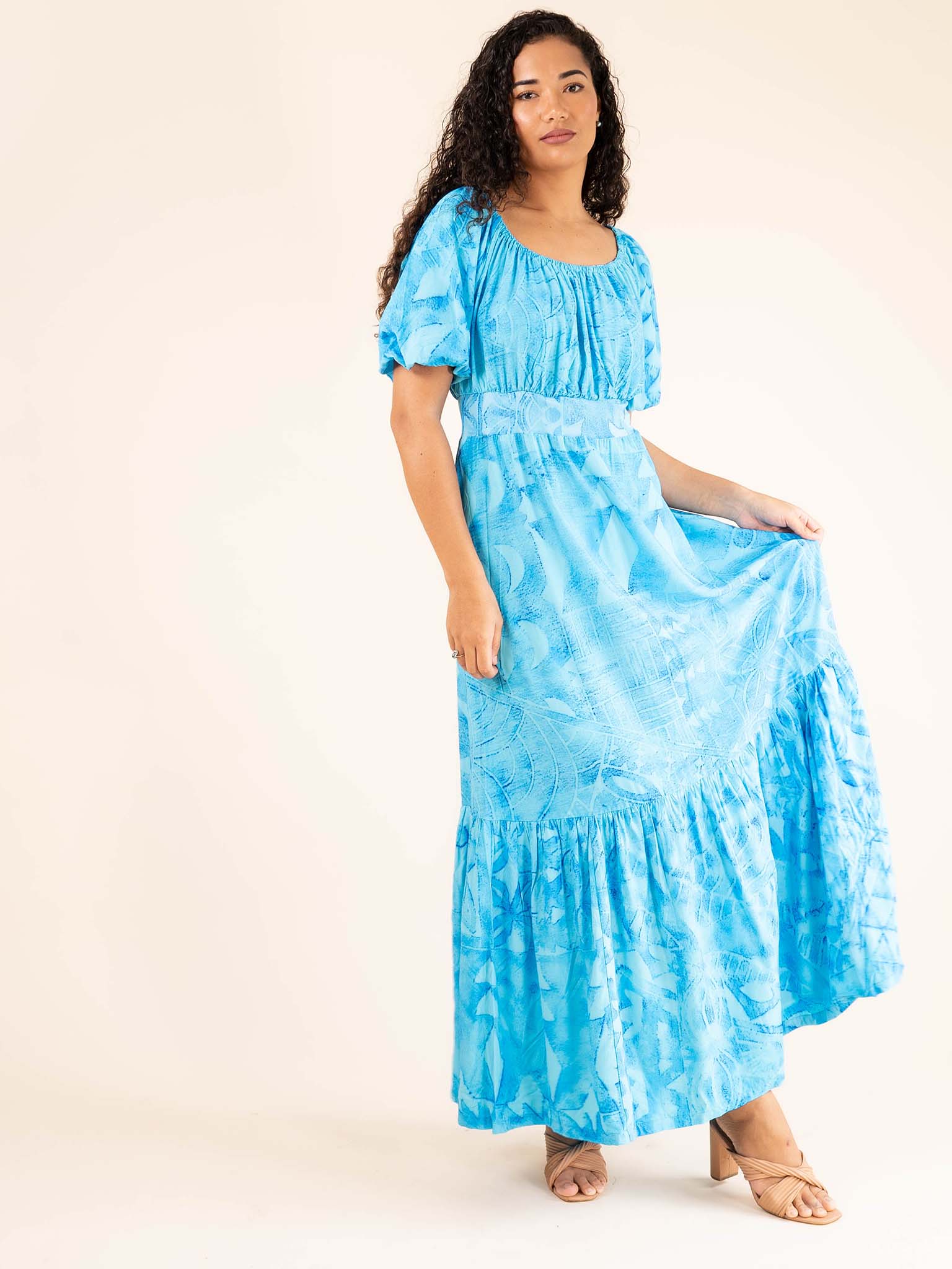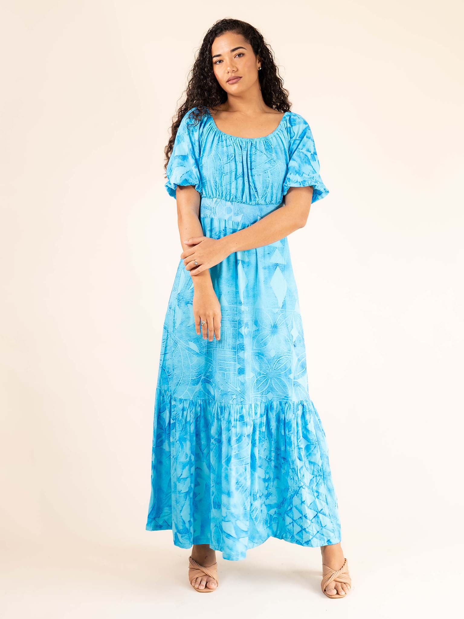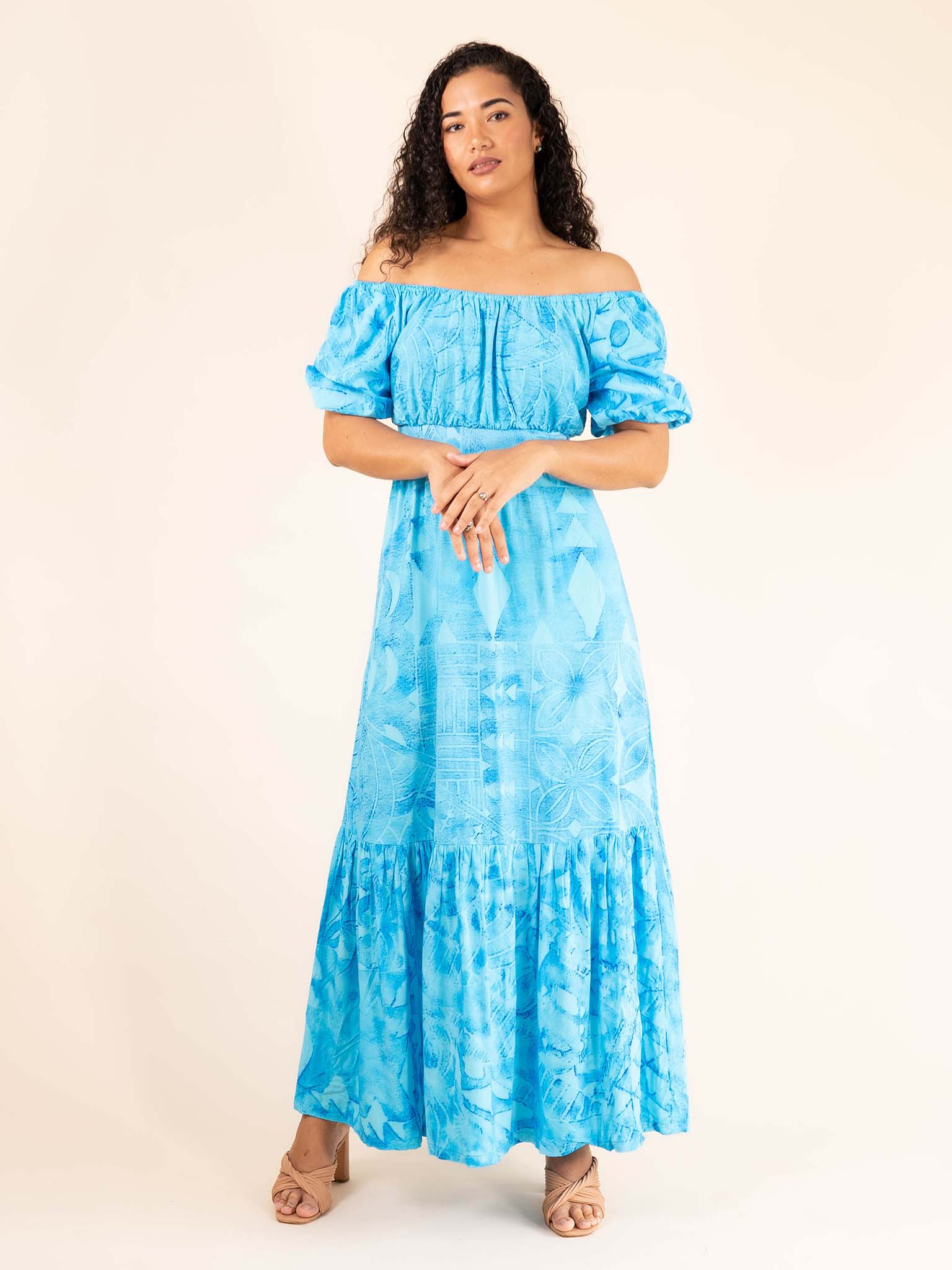 Desgined to be comfortable and elegant. It has a cotton spandex band above the waist. The rest of the dress is cotton rayon. A scoop neckline with puff sleeves that can be worn on or off the shoulder. Cinching at the waist and flowing to above the ankle. Perfect for a day to evening look.