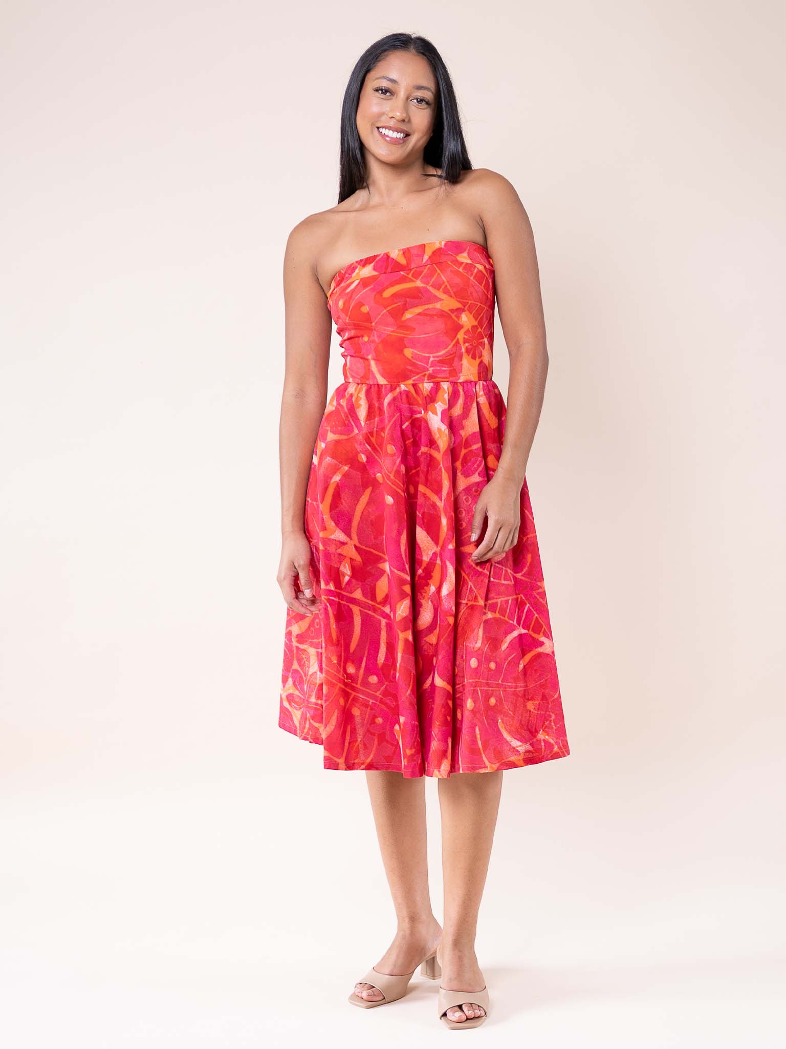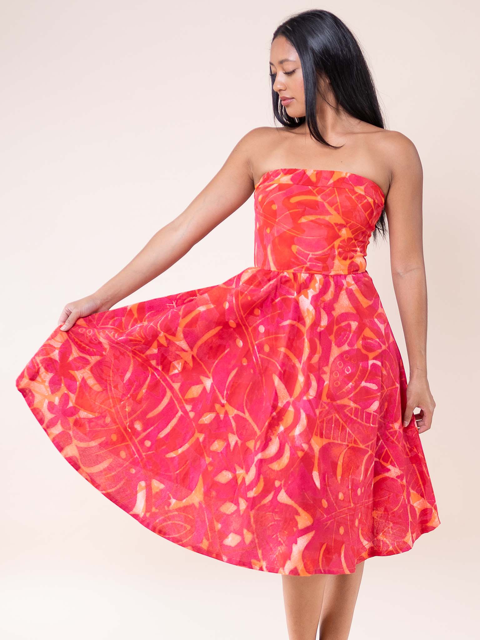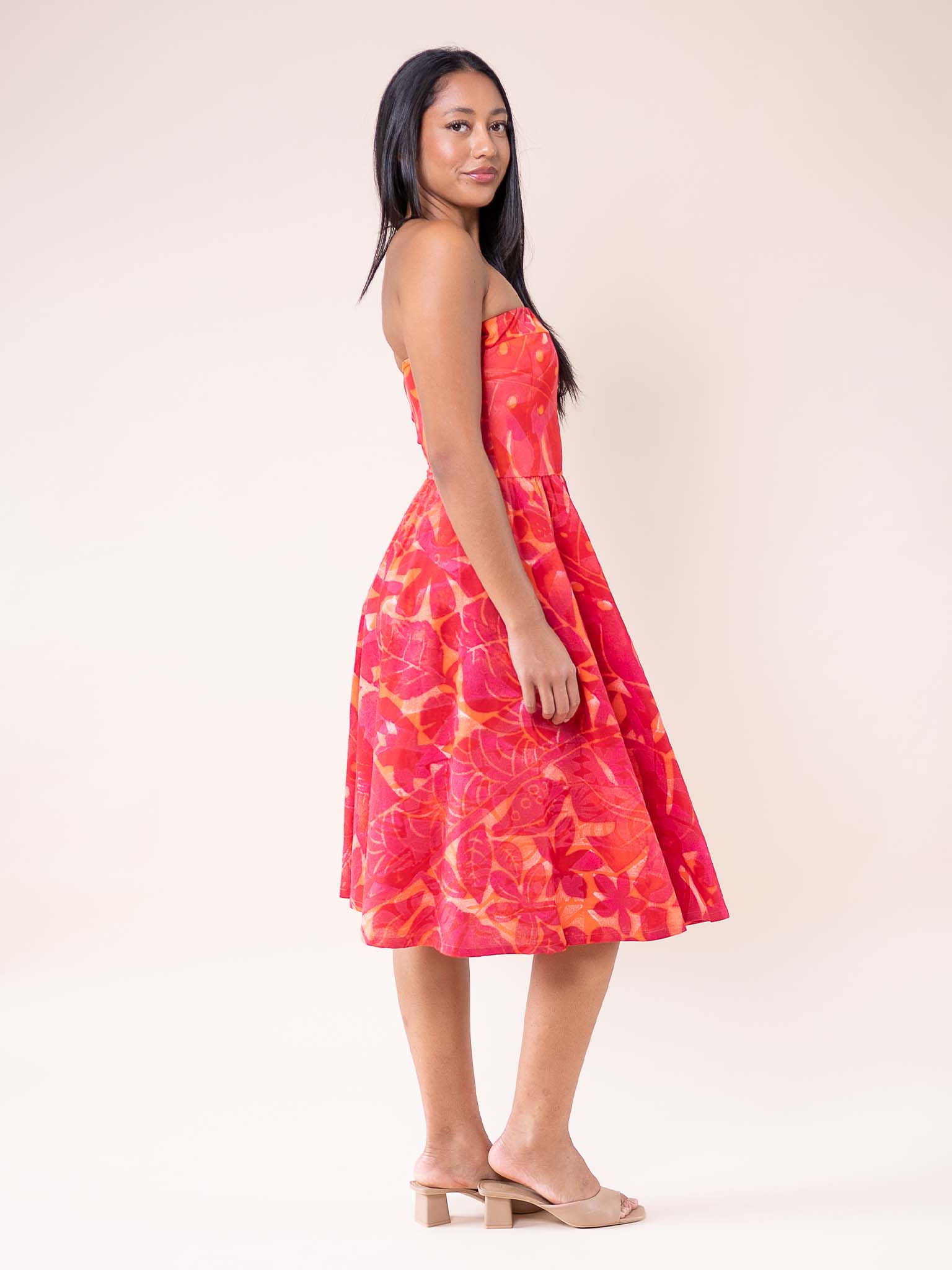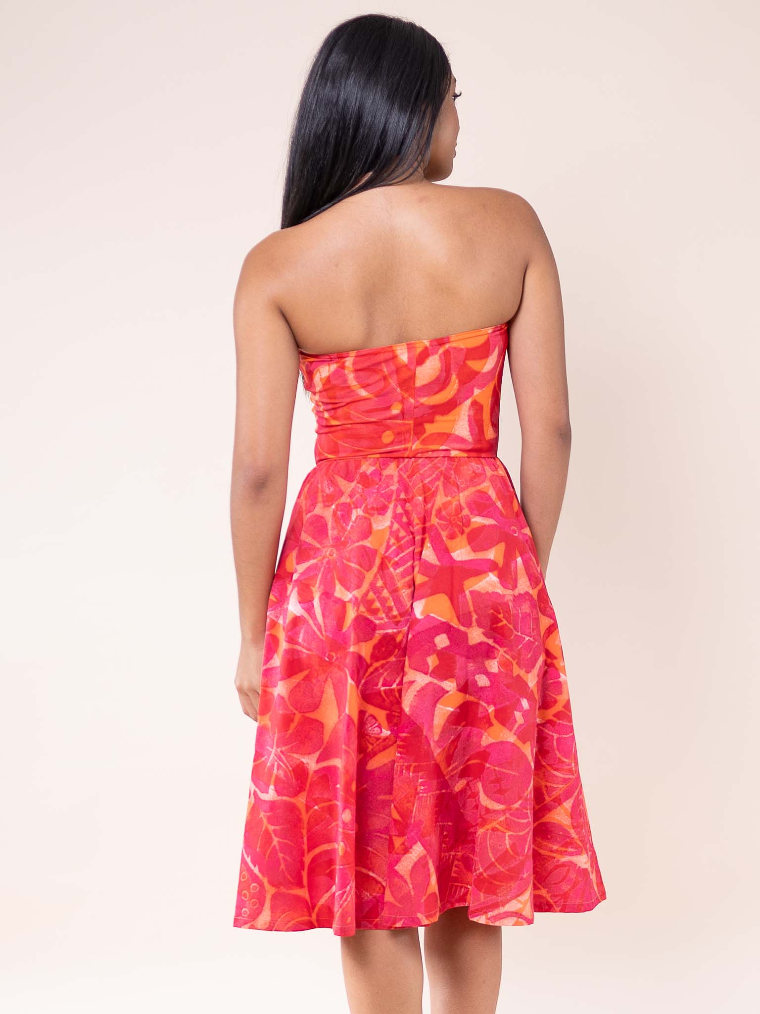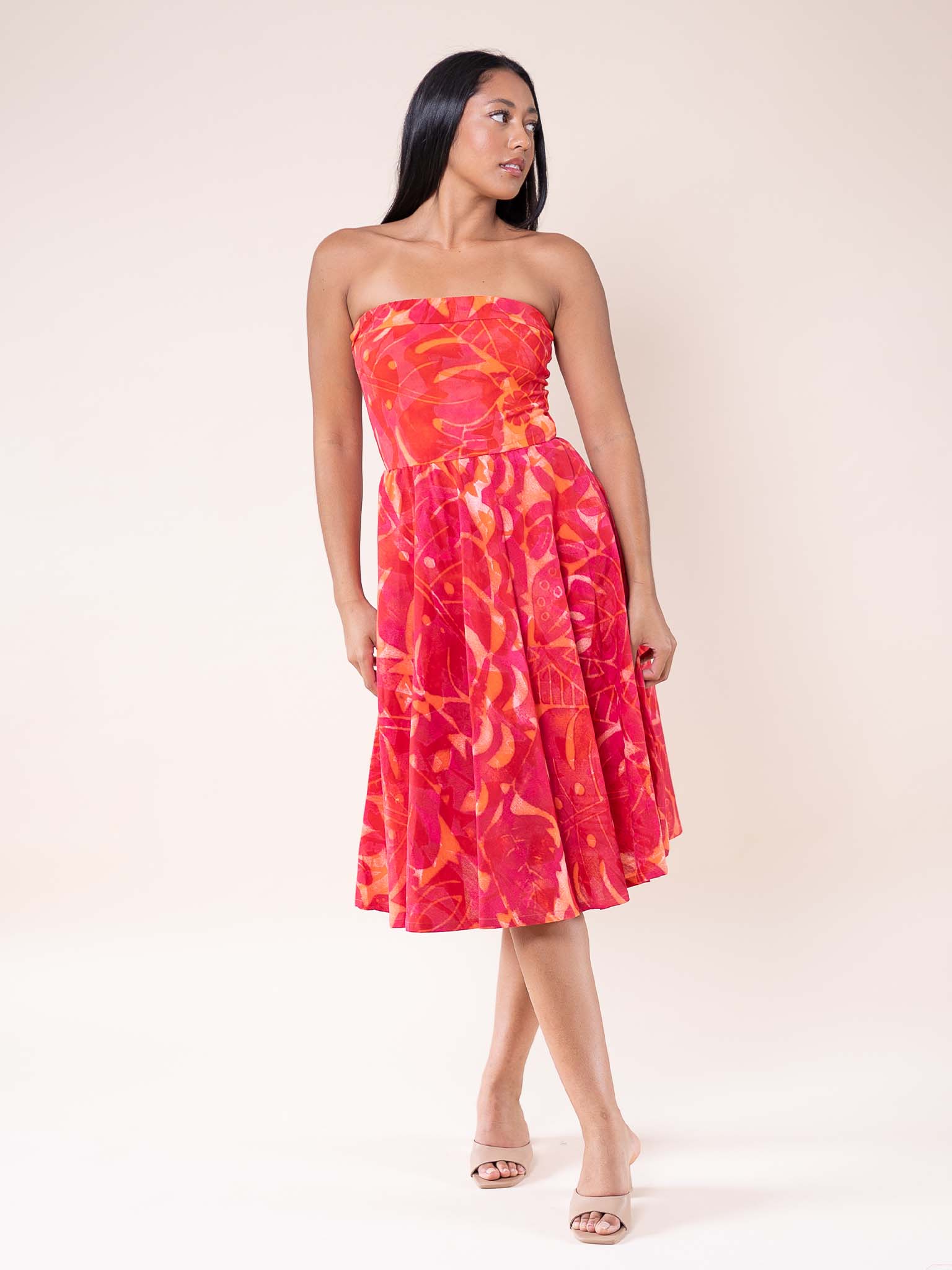 A 50's inspired cinched waist dress with a half full skirt dropping just below the knee. Featuring a strapless neckline.
