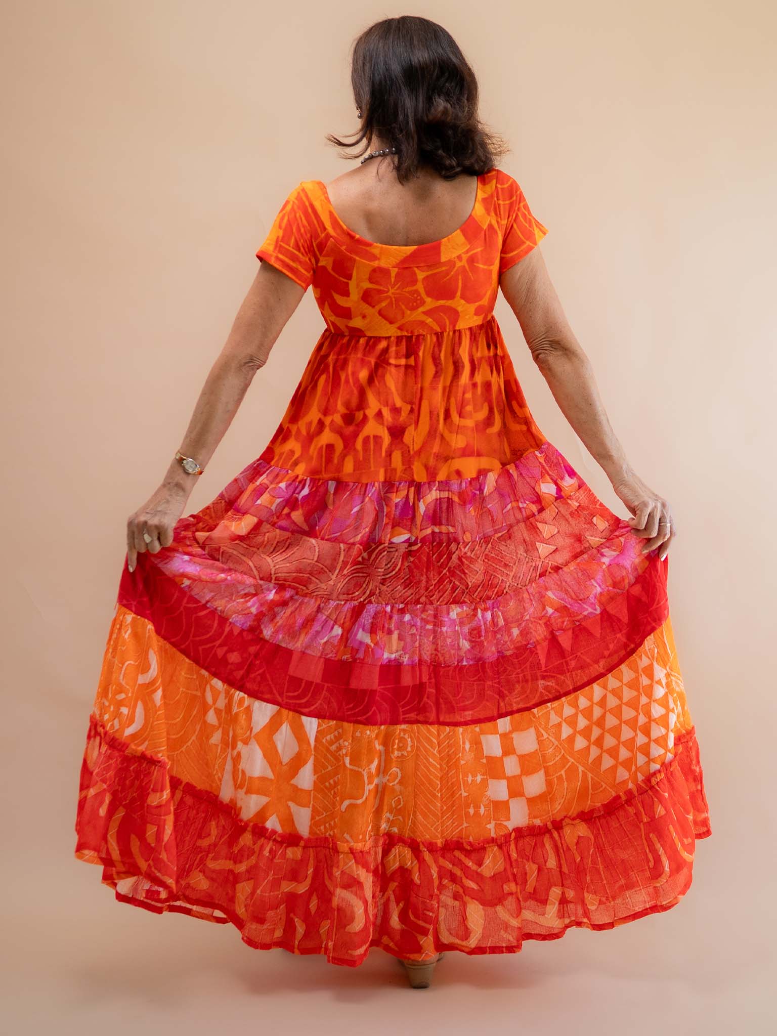 The Tiare Dress Long. A longer version of our best selling dress is crafted from our signature Cotton Lycra and Rayon blend. A scoop neck dress worn on or off the shoulder that cinches at the waist with multi ruffle drop skirt. Lined with a light cotton mull material.